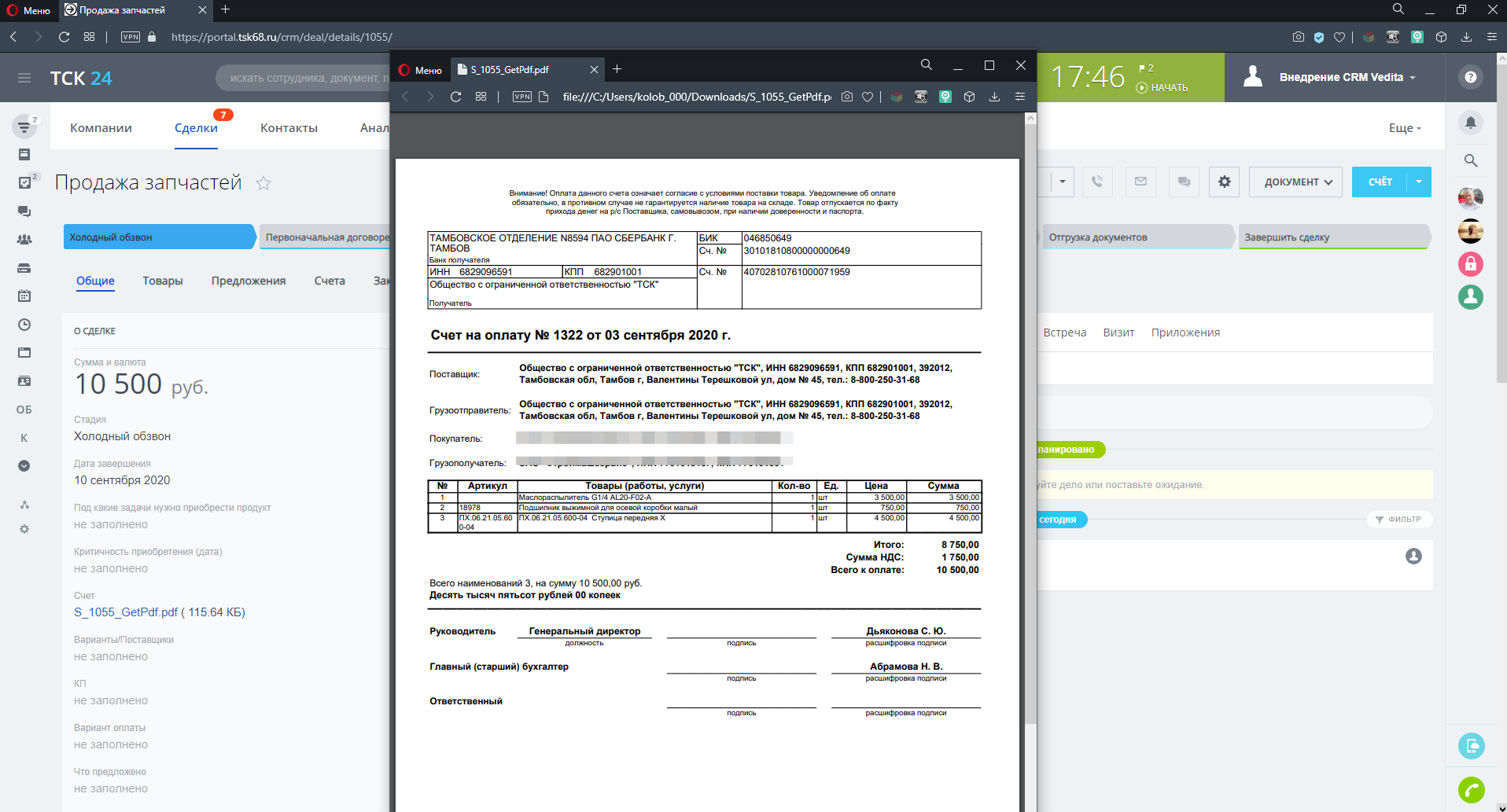 Товарный каталог ООО «ТСК» насчитывает 15 тысяч позиций, база контрагентов — свыше 1200 компаний. Им требуются CRM как возможность содержать в порядке клиентскую базу и наращивать продажи, и интеграция с 1С — для корректного ведения документооборота, отслеживания движения товара и выставления счетов.