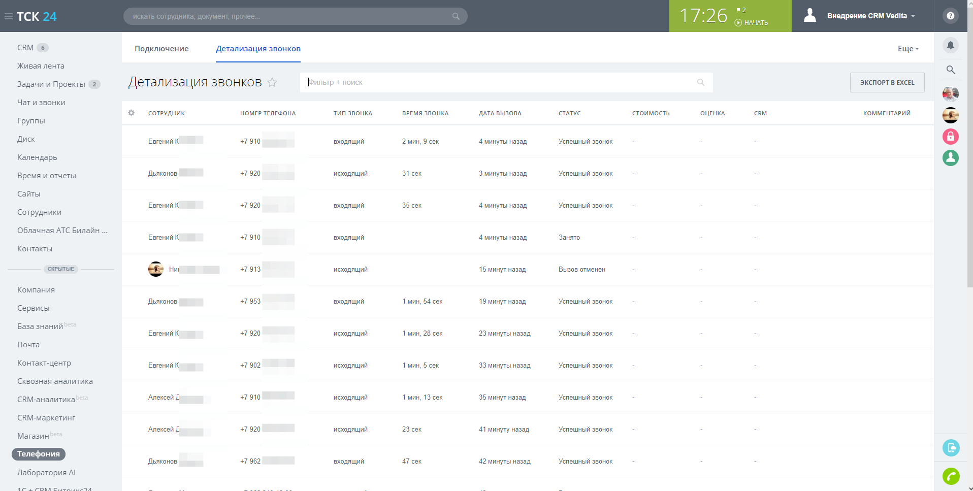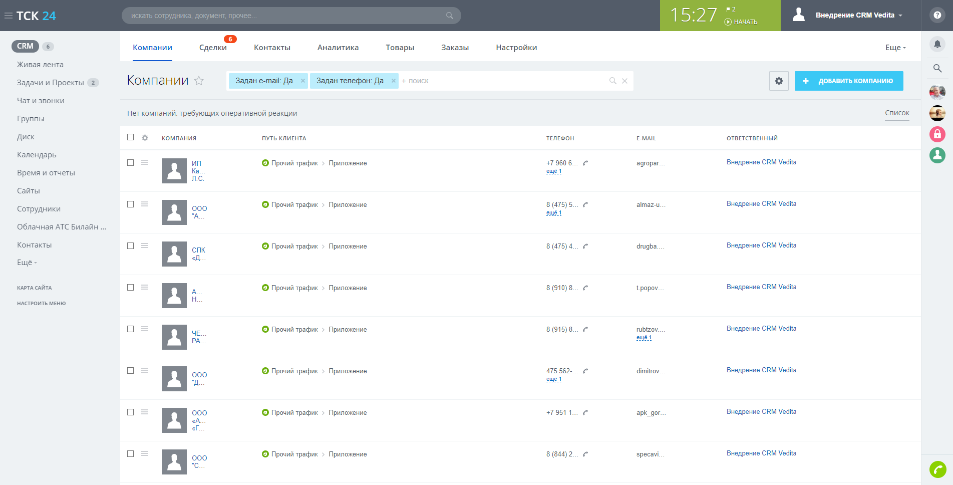 CRM интегрирована с облачной АТС Билайн Бизнес, через которую звонки идут из интерфейса Битрикс24. Также в CRM интегрирована электронная почта клиента: в карточках контрагентов видна вся история переписки, отправки документов, счетов и т.д.