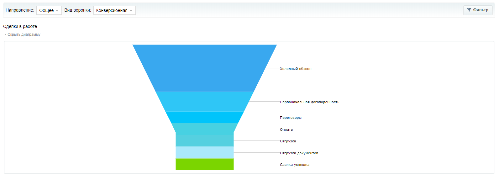 По продажам, вкладу в них отдельных менеджеров, лидам и стадиям сделок настроена отчётность.