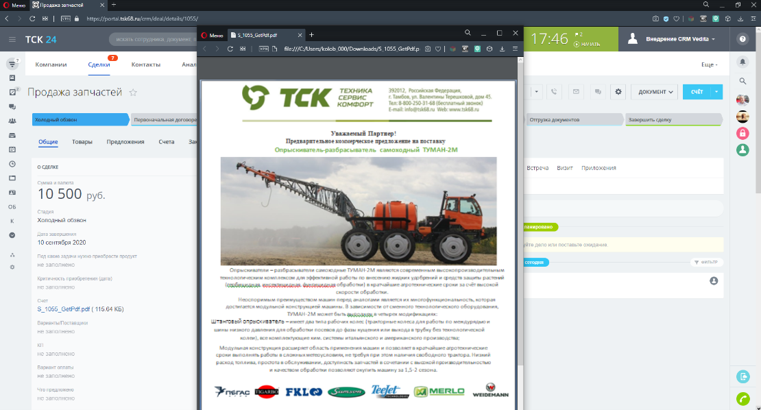 Мы также настроили генерацию коммерческих предложений по 3 основным шаблонам — внутри сделки менеджер выбирает нужное предложение, и в CRM автоматически формируется КП в .doc и .pdf форматах — со всеми описаниями, спецификацией техники, иллюстрациями, ценами и т.п.