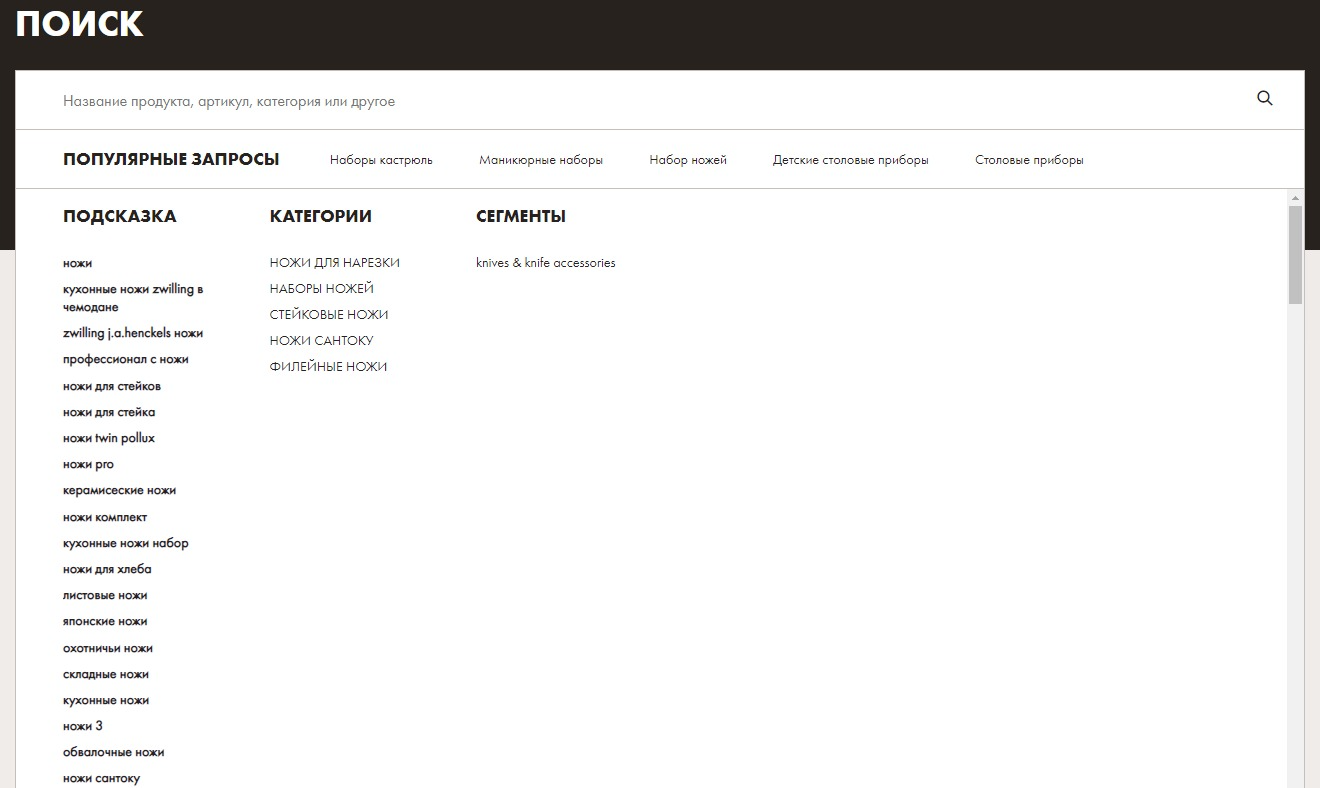 Этот же алгоритм сбора свойств товара позволил реализовать «умный» поиск. По мере набора запроса пользователю показываются подсказки как в поисковых системах, с выводом популярных запросов и показом категорий и сегментов, в которых представлен товар.