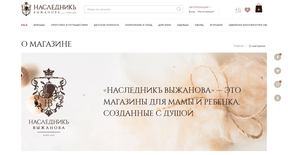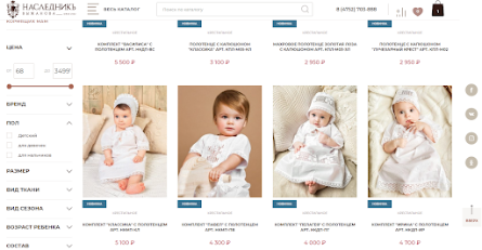 В каталоге магазина «НаследникЪ Выжанова» около 19 тысяч товаров. Чтобы пользователи не терялись во многообразии товарных предложений на сайте применяется постраничная навигация товаров — пагинация, используются разнообразные маркировки: «Лидеры продаж», «Новинка», «Горячее предложение», «Распродажа», «Новая коллекция». Есть возможность фильтрации (отбора) по возрасту, полу, материалу, цене.