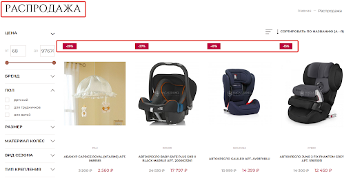 Акции в магазине представлены на главной странице и в каталоге, под каждую создаётся отдельная страница. На страницу акции, помимо описания и баннера, подгружаются товары, на которые она распространяется — это удобно для пользователей (все акционные товары в одном месте) и для ведения рекламы.