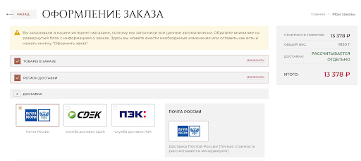 Доставку можно выбирать: Почта России, Байкал сервис, Деловые линии, службы СДЭК, ПЭК, курьерские службы или самовывоз.
