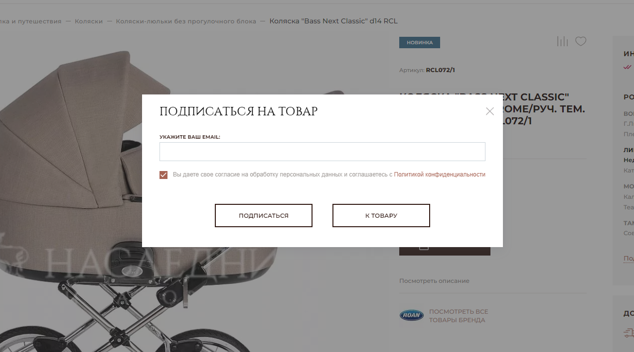 Карточки товаров, помимо информации о вариантах покупки и наличии, содержат форму для сбора контактов, чтобы прислать уведомление когда товар поступит в продажу онлайн или будет доставлен в офлайновый магазин.
